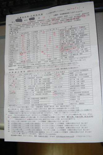 診断。治療説明書。 診断名、検査結果、治療薬の説明、 食事についても書いてあり、 ドッグフードは、防腐剤、添加剤、着色剤、香料、嗜好剤が配合してあり、食品偽装の時代、動物の餌には捜査義務は無いので、危険、とのお考えのようだ。 シャンプーは温風ドライヤーは禁止と。 薬の飲ませ方も書いてある。 |