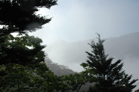 ![]() この霧じゃあ、何も見えないかな? 頂上に着いた頃には晴れるかな? |