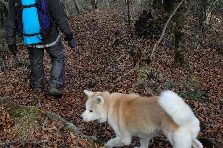 ![]() ここを下ったら、米背負峠だ。 けっこう急な下り。 足元はずるずる。 駆け下りるだっちゃん。 ずるっと滑ってお尻をついた親分。 |