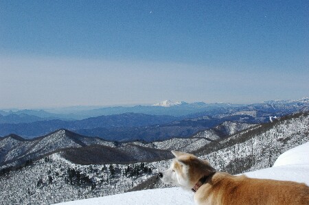 お昼ご飯を食べる所を物色しながら 少し下って、 あんまり下ると、綺麗な景色が木に隠れて見えなくなるし、なかなか難しいとこだよ。 なんとか風が弱そうなとこで、座り込んでお昼。 かなり寒かったらしくて、だっちゃんのお水のおわん、紙皿なのに、入れたお水がすぐ凍ったんで吃驚。 これじゃあ、飲めないね。雪を舐めるからいいけど。 |