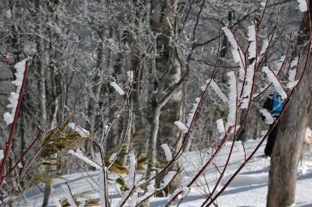![]() 霧氷と言うには、氷が大きいだろうか? 時々、風で飛ばされたのが顔に当たって痛い! |