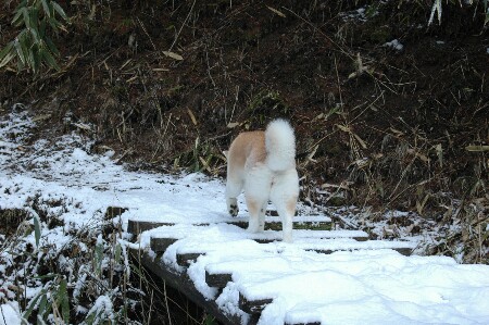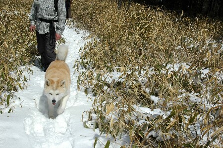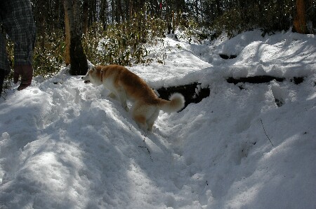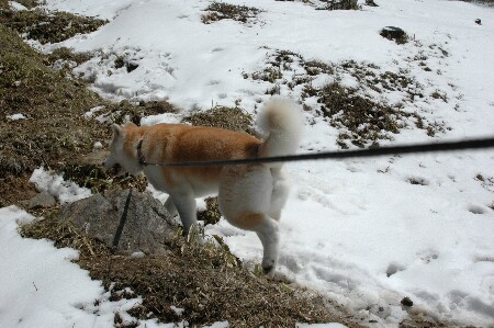 ![]() けっこう雪は深いんだよ。 歩くのは大変。 最近は立ち止まるとすぐしっぽが下がる。 |