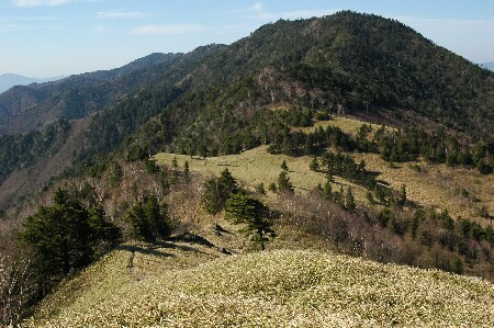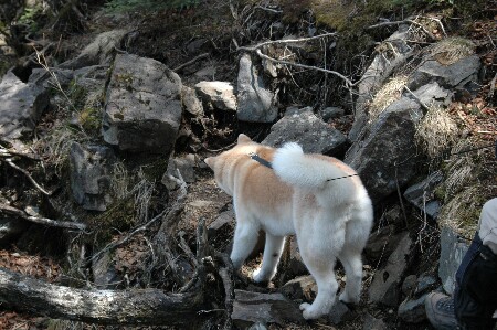 ![]() 天狗棚山から。 このあたりの道は石ころが多くて、だっちゃんのペースはちょっと落ち気味。 |