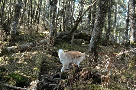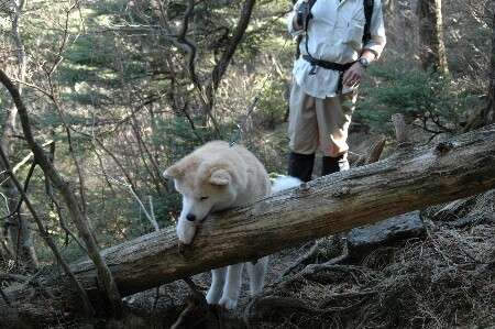 おやつを食べ終わるなり、さっさと歩き出そうとしただっちゃんだったけど、 人間達は、「待て、もう少し休もう。」って言う。 気勢をそがれただっちゃんは、ふてくされて伏せた。 んで、人間達が、「さあ、行こう。」って言い出した時は、 やだよ、だっちゃん、もう一度おやつを貰うまで動かないよ、と抗議した。 抗議したけど、無視されたんで、しぶしぶ歩き出した。 だけど、歩き出してから、忘れ物がある、って、戻ってやったんだ。 根負けした人間は、仕方なくおやつを出し、だっちゃんはバニラケーキをせしめた。 頭の差だね。 天狗棚山に登ろうとしたら、20人くらいのグループの方達が下りだしたところだった。 すれ違うのも大変そうだな、って思っていたら、左に道がある。 どこに出るのかな?行き止まりかな?って思ったけど、 例え、戻る事になっても、待ってる事を考えたら、動いてる方が気が楽かな? って、事で進んでみたら、 ササで道がだんだん狭くなり、笹藪がだんだん深くなり、歩くとガサガサ音がして、だっちゃんは嬉しくなった。 |