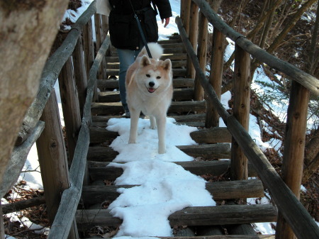 ![]() 所々に、丸太を組み合わせた木の橋がある。 見た目のわりにしっかりしてて揺れないから、だっちゃんは渡れるよ。 |