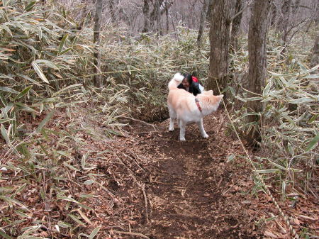![]() 神社を過ぎて、いよいよ山道。 張り切っちゃうよ。 けっこう急な登り。 足元がドロドロで滑るから、大変だよ。 だっちゃんは嬉しくてはしゃいじゃう。 |