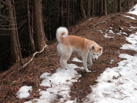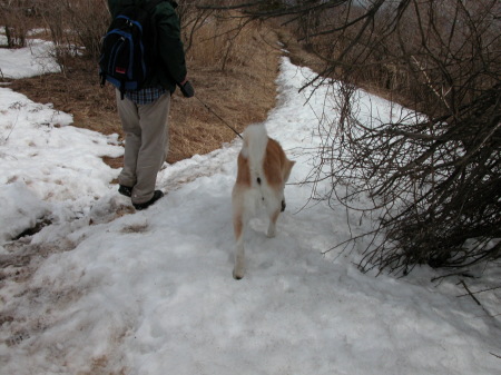 ![]() あとはもう、単調な尾根歩きの道で、ちょっと詰まらない。 でも、雪が残ってると楽しい。 狩りごっこをして遊びながら進んだ。 「狩りごっこ」って、獲物がいるつもりで、木の根本や、茂みに鼻を突っ込んで、出てきた獲物を回り込んで捕まえる、つもりの遊びなんだよ。 見えない獲物を捕まえるつもりの遊びなんだ。 でも、この山は、あんまり動物の気配がしない山だよ。 |