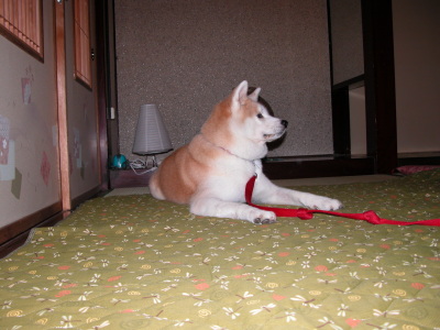 | 部屋で、持参の敷物を敷いて、くつろぐだっちゃん。 客室のなかは、ご自由に、って事だけど、だっちゃんは信用無いから、リードをつけたまま。 |