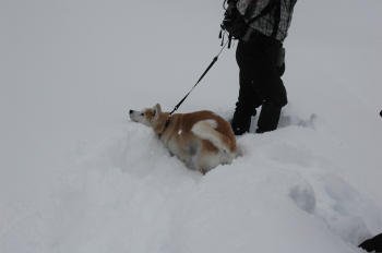 | スノーシュートレッキングだ 2005/12/20 火 急遽休みを取って、今日はスノーシュートレッキングだよ。 目指すは、一の倉沢。 あんまり凄い雪なんで、お腹まで雪に埋もれてしまう。 おまけに重たい雪なんで、歩きながら体で蹴散らす、ってわけに行かない。 前日まで大雪で、吹雪やなだれもあったそうで、行けないかもしれない、って話だったんだけど、 今日は、雪も止んで風も無い。 表層雪崩も起きそうにない、って事で、目的地まで行けた。 谷川岳も一の倉岳もちゃんと見えて、うちの人間は大感激! 往きはすごい雪に埋もれてなかなか進めないから、みんなの後を付いて歩いてただっちゃんだったけど、 帰りは道が出来てるんで、先頭を歩こうとしては、 「自分勝手だなー!」って呆れられた。 だって、 人間は、スノーシューなんて付けてるからいいけど、だっちゃんはけっこう大変なんだよ。 どこに行っても自分の足だけで歩いてるんだもんね。 でも、いっぱいの雪のなか、誰もいないくて、 この世界独り占め!、って感じで、とっても気持ちが良かったよ! 大量の重い雪に、ちょっとたじろいだけど、楽しかった! 今度は、もっと軽い雪の中で歩きたいな! 薄毛、ハゲ腹のだっちゃんは、寒くないかな?お腹にしもやけが出来ないかな? なんて、心配されたけど、大丈夫、ぜんぜん寒くなかったよ。 これで一気に毛が生えないかな?って人間は期待してる。 |