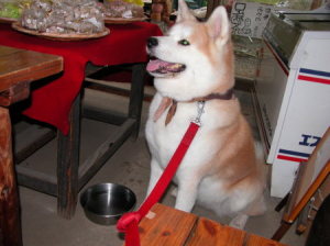 | ドッグカフェーだって言うんだけど、今度も変。 日本語訳は、犬茶屋だから、ここは、間違い無く茶屋だし(茶屋って書いてあった)、だっちゃんも中に入れて貰えたから、間違いないって、言うんだけど。。。 メニューは、蕎麦にうどん、おやきに田楽、お汁粉。。。 お蕎麦は、けっこう美味しかったって。 |